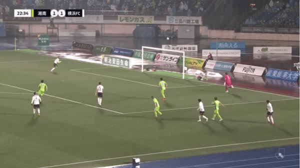 Trong tình huống này dẫn đến pha phản lưới, Yokohama FC nỗ lực triển khai bóng từ sân nhà. Dưới sức ép của Shonan, họ lúng túng, không còn phương án chuyền cự ly ngắn.