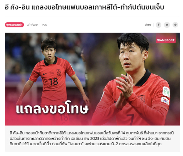 Tờ báo hàng đầu ở Hàn Quốc dẫn nguồn Siam Sports cho biết, người Thái đang đặc biệt quan tâm đến khả năng KFA sẽ sử dụng biện pháp kỷ luật bằng cách không gọi tên 2 ngôi sao hàng đầu là Son Heung-min (Tottenham) và Lee Kang-in (Paris Saint-Germain) ở các trận đấu với Thái Lan vào tháng 3 tới. Điều này đến từ phát biểu của Chủ tịch KFA, ông Chung Mong-gyu hôm 16/02 vừa qua.